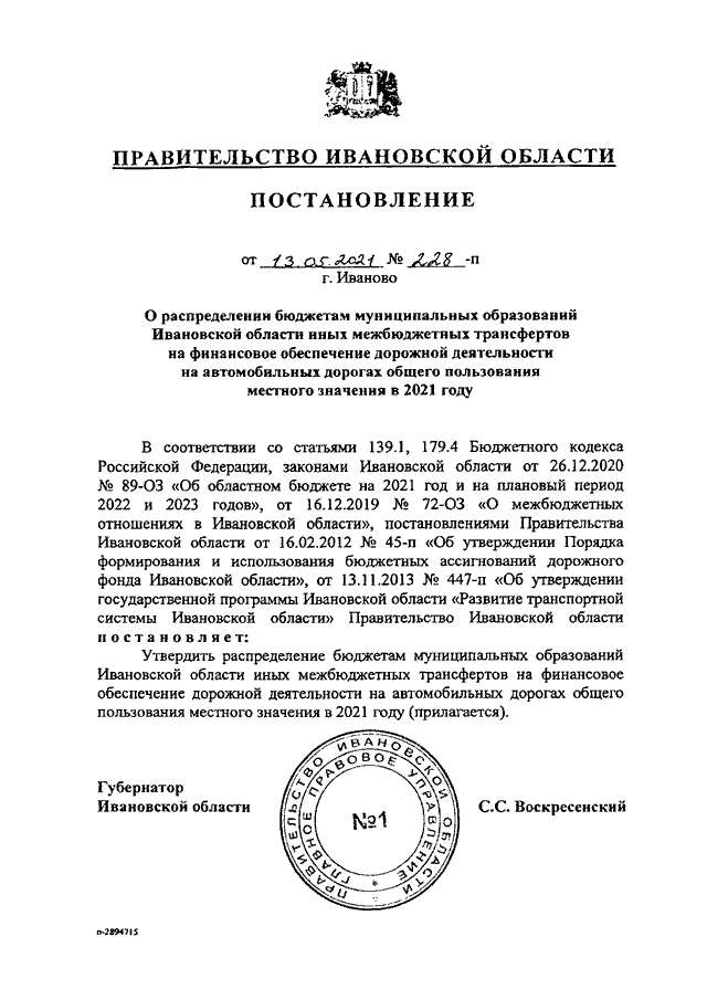 Постановление Правительства Ивановской области от 13.05.2021 N 228-п "О распределении бюджетам муниципальных образований Ивановской области иных межбюджетных трансфертов на финансовое обеспечение дорожной деятельности на автомобильных дорогах общего пользования местного значения в 2021 году"