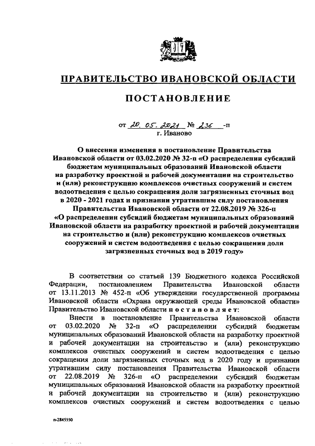 Постановление Правительства Ивановской области от 20.05.2021 N 236-п "О внесении изменения в постановление Правительства Ивановской области от 03.02.2020 N 32-п "О распределении субсидий бюджетам муниципальных образований Ивановской области на разработку проектной и рабочей документации на строительство и (или) реконструкцию комплексов очистных сооружений и систем водоотведения с целью сокращения доли загрязненных сточных вод в 2020 - 2021 годах и признании утратившим силу постановления Правительства Ивановской области от 22.08.2019 N 326-п "О распределении субсидий бюджетам муниципальных образований Ивановской области на разработку проектной и рабочей документации на строительство и (или) реконструкцию комплексов очистных сооружений и систем водоотведения с целью сокращения доли загрязненных сточных вод в 2019 году"