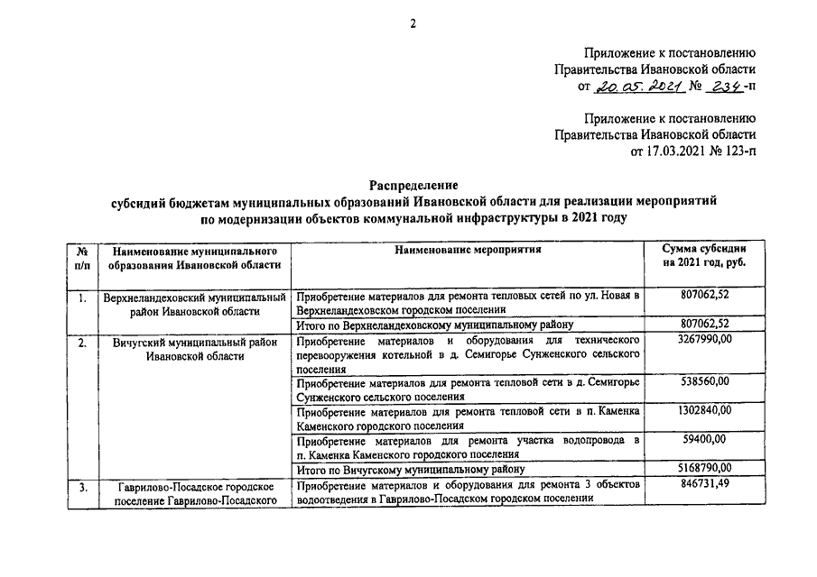 Постановление Правительства Ивановской области от 20.05.2021 N 234-п "О внесении изменения в постановление Правительства Ивановской области от 17.03.2021 N 123-п "О распределении субсидий бюджетам муниципальных образований Ивановской области для реализации мероприятий по модернизации объектов коммунальной инфраструктуры в 2021 году"