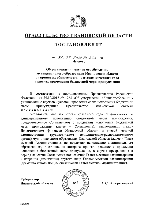 Постановление Правительства Ивановской области от 20.05.2021 N 233-п "Об установлении случая освобождения муниципального образования Ивановской области от принятых обязательств по итогам отчетного года в рамках применения бюджетной меры принуждения"