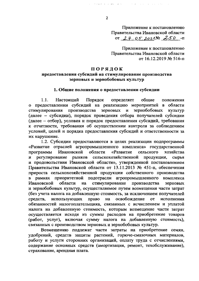 Постановление Правительства Ивановской области от 27.05.2021 N 250-п "О внесении изменений в постановление Правительства Ивановской области от 16.12.2019 N 516-п "Об утверждении Порядка предоставления субсидий на стимулирование производства зерновых и зернобобовых культур"