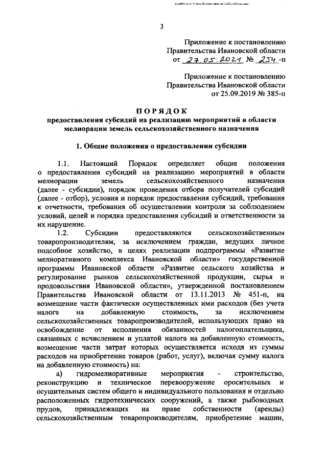 Постановление Правительства Ивановской области от 27.05.2021 N 254-п "О внесении изменений в постановление Правительства Ивановской области от 25.09.2019 N 385-п "Об утверждении Порядка предоставления субсидий на реализацию мероприятий в области мелиорации земель сельскохозяйственного назначения"