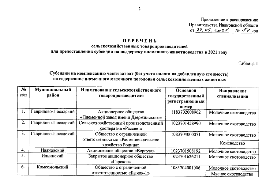 Распоряжение Правительства Ивановской области от 27.05.2021 N 51-рп "Об утверждении Перечня сельскохозяйственных товаропроизводителей для предоставления субсидии на поддержку племенного животноводства в 2021 году"