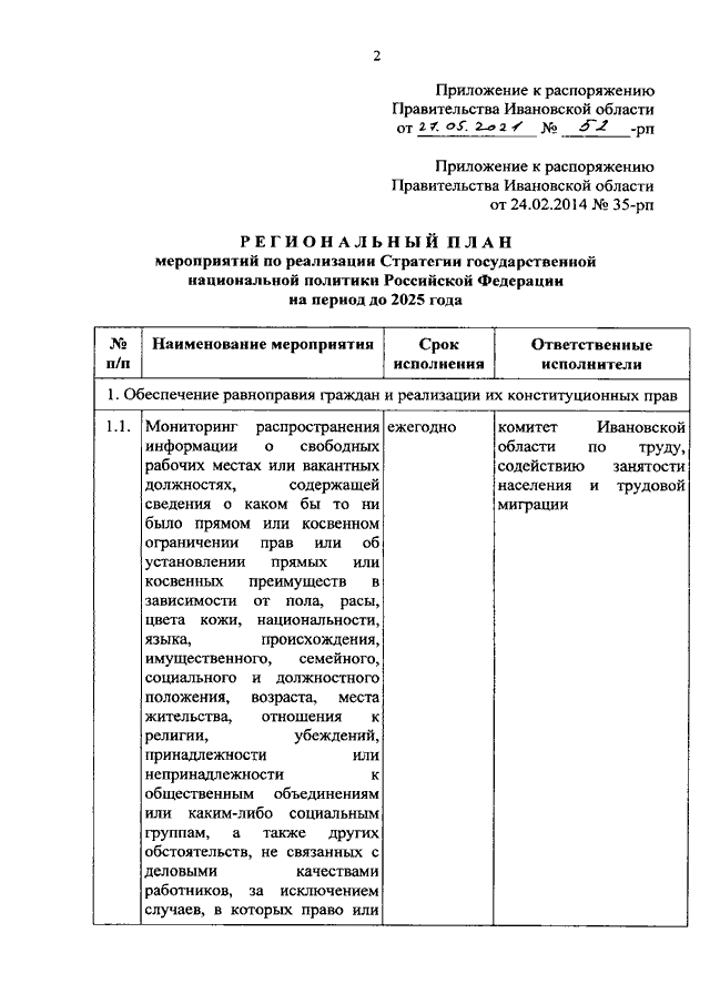 Распоряжение Правительства Ивановской области от 27.05.2021 N 52-рп "О внесении изменения в распоряжение Правительства Ивановской области от 24.02.2014 N 35-рп "Об утверждении регионального плана мероприятий по реализации Стратегии государственной национальной политики Российской Федерации на период до 2025 года"