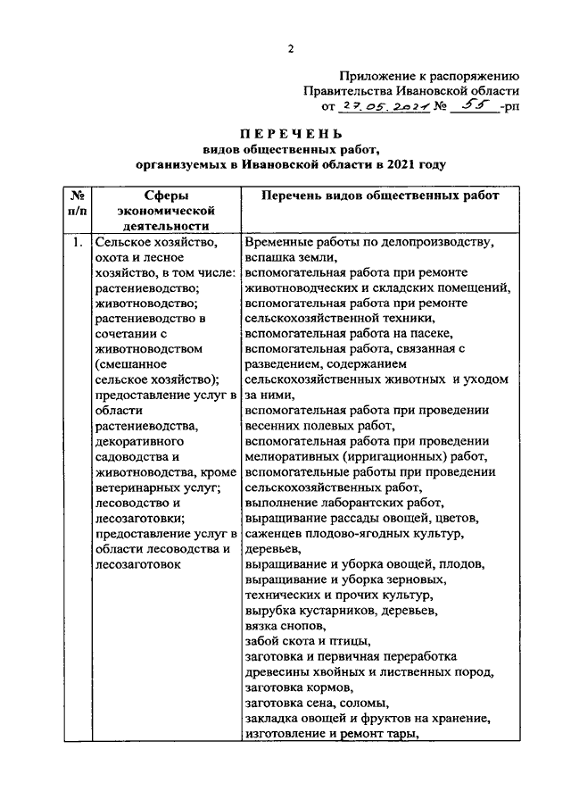 Распоряжение Правительства Ивановской области от 27.05.2021 N 55-рп "Об утверждении перечня видов общественных работ, организуемых в Ивановской области в 2021 году"
