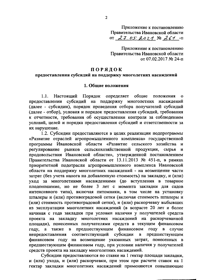 Постановление Правительства Ивановской области от 27.05.2021 N 261-п "О внесении изменений в постановление Правительства Ивановской области от 07.02.2017 N 24-п "Об утверждении Порядка предоставления субсидий на поддержку многолетних насаждений"