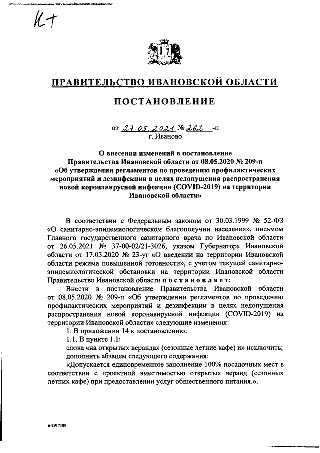 Постановление Правительства Ивановской области от 27.05.2021 N 262-п "О внесении изменений в постановление Правительства Ивановской области от 08.05.2020 N 209-п "Об утверждении регламентов по проведению профилактических мероприятий и дезинфекции в целях недопущения распространения новой коронавирусной инфекции (COVID-2019) на территории Ивановской области"