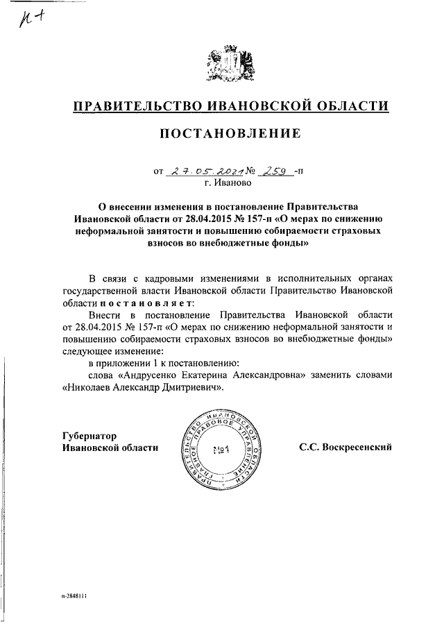 Постановление Правительства Ивановской области от 27.05.2021 N 259-п "О внесении изменения в постановление Правительства Ивановской области от 28.04.2015 N 157-п "О мерах по снижению неформальной занятости и повышению собираемости страховых взносов во внебюджетные фонды"
