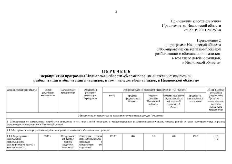 Постановление Правительства Ивановской области от 27.05.2021 N 257-п "О внесении изменения в постановление Правительства Ивановской области от 16.01.2019 N 1-п "Об утверждении программы Ивановской области "Формирование системы комплексной реабилитации и абилитации инвалидов, в том числе детей-инвалидов, в Ивановской области" (вместе с "Перечнем мероприятий программы Ивановской области "Формирование системы комплексной реабилитации и абилитации инвалидов, в том числе детей-инвалидов, в Ивановской области")