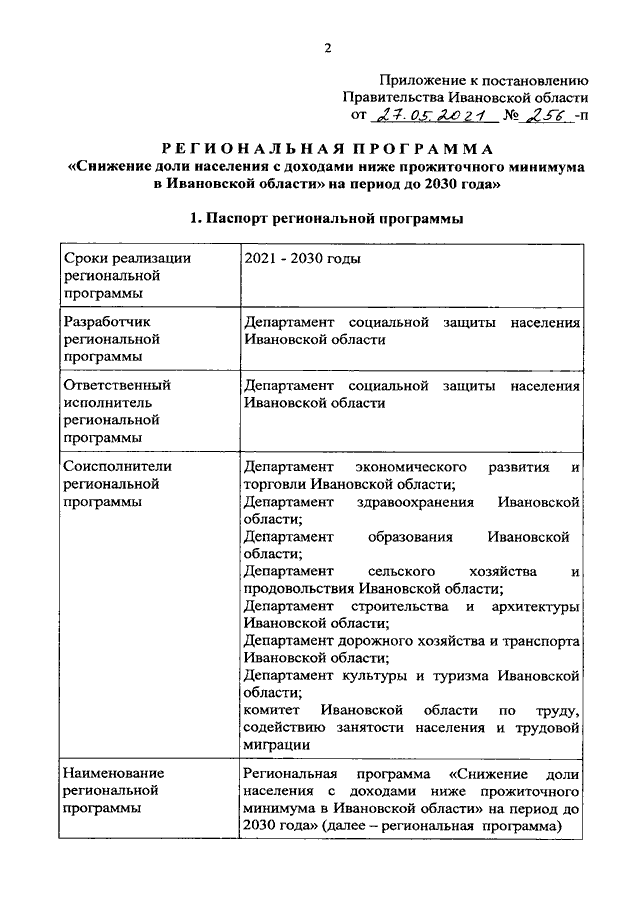 Постановление Правительства Ивановской области от 27.05.2021 N 256-п "Об утверждении региональной программы "Снижение доли населения с доходами ниже прожиточного минимума в Ивановской области" на период до 2030 года"