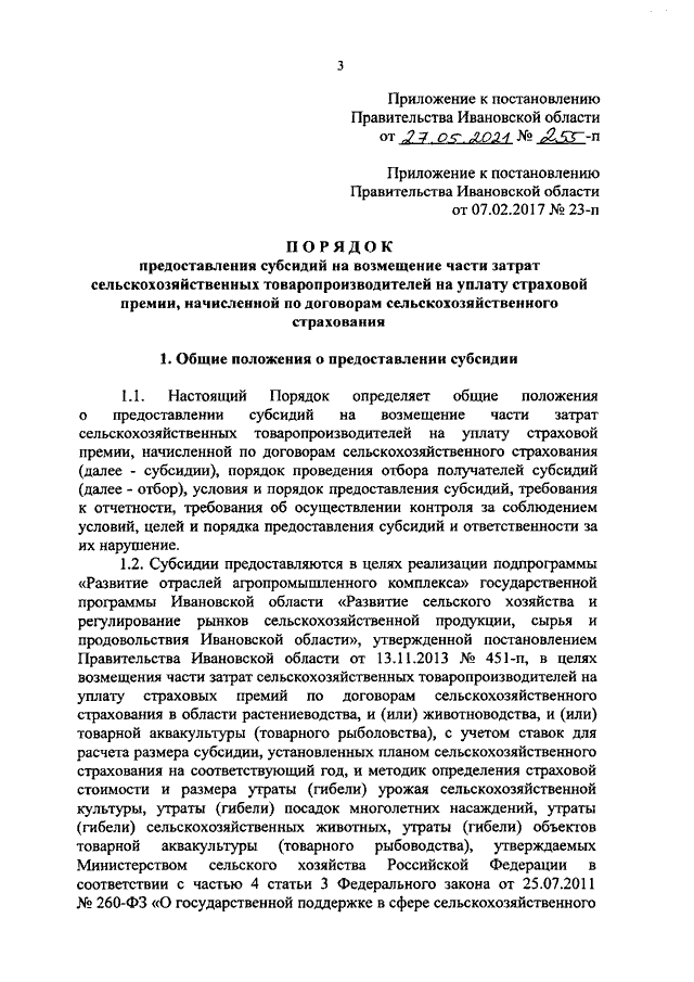 Постановление Правительства Ивановской области от 27.05.2021 N 255-п "О внесении изменений в постановление Правительства Ивановской области от 07.02.2017 N 23-п "Об утверждении порядка предоставления субсидий на возмещение части затрат сельскохозяйственных товаропроизводителей на уплату страховой премии, начисленной по договорам сельскохозяйственного страхования"