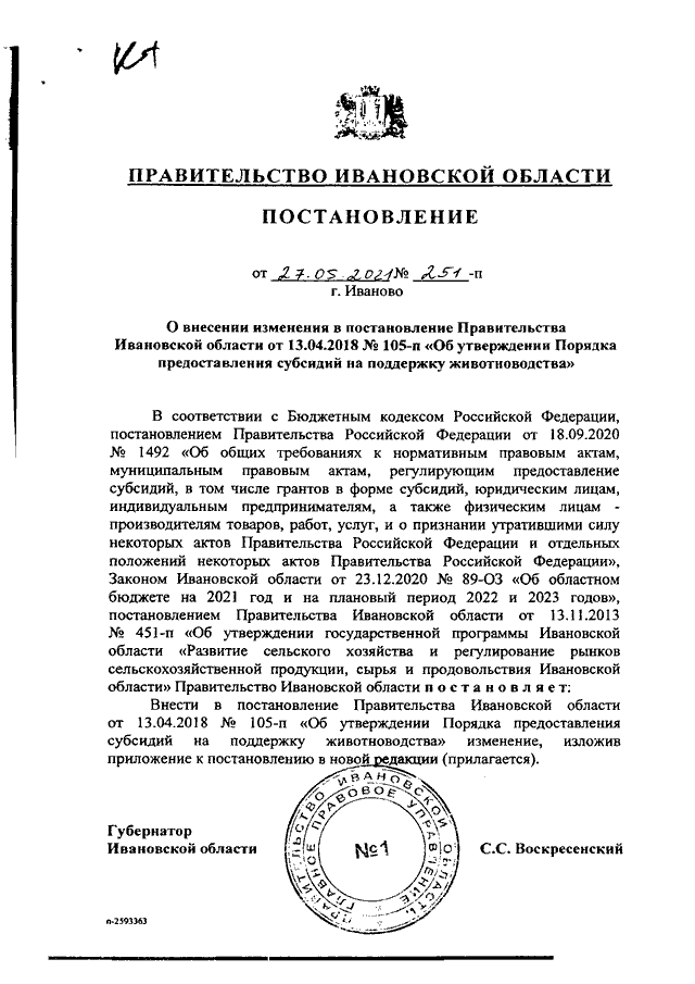 Постановление Правительства Ивановской области от 27.05.2021 N 251-п "О внесении изменения в постановление Правительства Ивановской области от 13.04.2018 N 105-п "Об утверждении Порядка предоставления субсидий на поддержку животноводства"