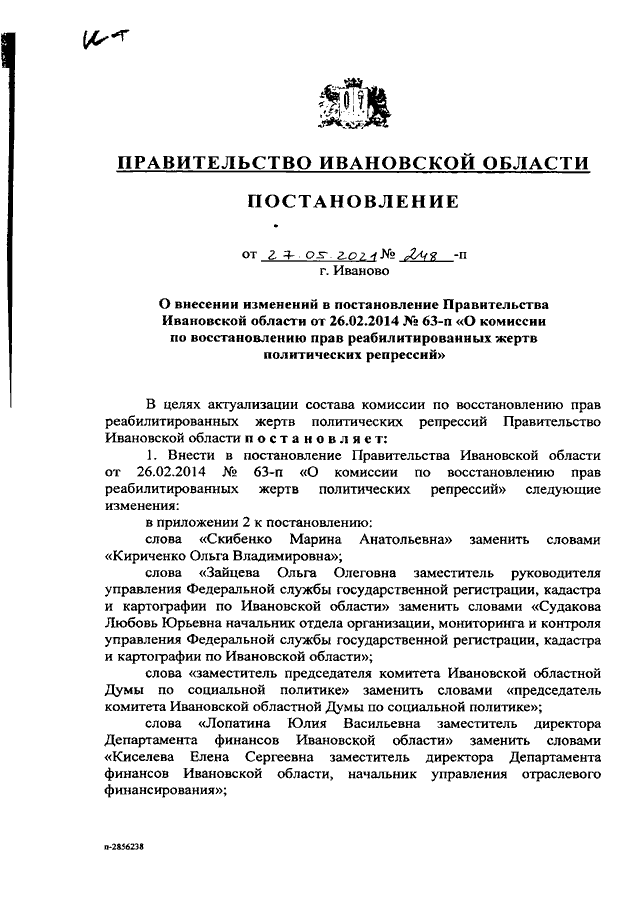 Постановление Правительства Ивановской области от 27.05.2021 N 248-п "О внесении изменений в постановление Правительства Ивановской области от 26.02.2014 N 63-п "О комиссии по восстановлению прав реабилитированных жертв политических репрессий"