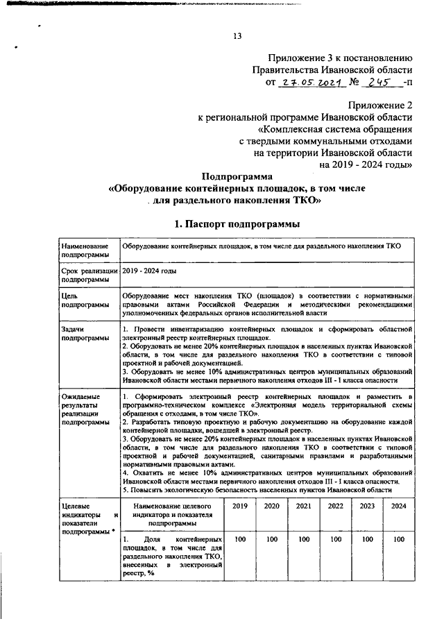 Постановление Правительства Ивановской области от 27.05.2021 N 245-п "О внесении изменений в постановление Правительства Ивановской области от 03.04.2019 N 119-п "Об утверждении региональной программы Ивановской области "Комплексная система обращения с твердыми коммунальными отходами на территории Ивановской области на 2019 - 2024 годы" (вместе с "Подпрограммой "Электронная модель территориальной схемы обращения с отходами, в том числе ТКО", "Подпрограммой "Оборудование контейнерных площадок, в том числе для раздельного накопления ТКО", "Подпрограммой "Создание и увеличение мощностей объектов обработки, утилизации, обезвреживания, размещения ТКО")