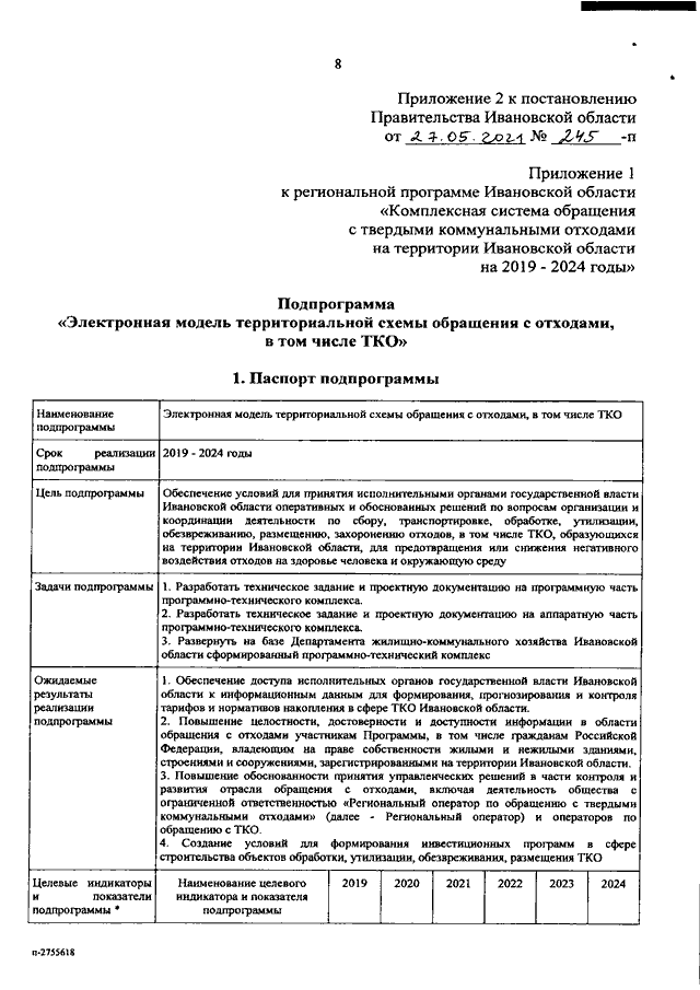Постановление Правительства Ивановской области от 27.05.2021 N 245-п "О внесении изменений в постановление Правительства Ивановской области от 03.04.2019 N 119-п "Об утверждении региональной программы Ивановской области "Комплексная система обращения с твердыми коммунальными отходами на территории Ивановской области на 2019 - 2024 годы" (вместе с "Подпрограммой "Электронная модель территориальной схемы обращения с отходами, в том числе ТКО", "Подпрограммой "Оборудование контейнерных площадок, в том числе для раздельного накопления ТКО", "Подпрограммой "Создание и увеличение мощностей объектов обработки, утилизации, обезвреживания, размещения ТКО")