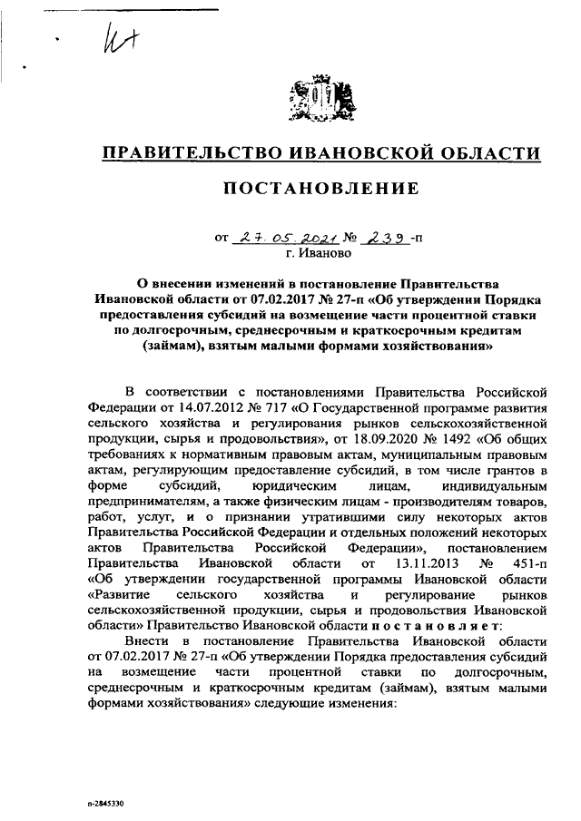 Постановление Правительства Ивановской области от 27.05.2021 N 239-п "О внесении изменений в постановление Правительства Ивановской области от 07.02.2017 N 27-п "Об утверждении Порядка предоставления субсидий на возмещение части процентной ставки по долгосрочным, среднесрочным и краткосрочным кредитам (займам), взятым малыми формами хозяйствования"
