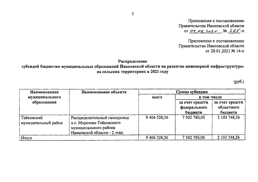 Постановление Правительства Ивановской области от 04.06.2021 N 265-п "О внесении изменения в постановление Правительства Ивановской области от 28.01.2021 N 14-п "О распределении субсидий бюджетам муниципальных образований Ивановской области на развитие инженерной инфраструктуры на сельских территориях в 2021 году"