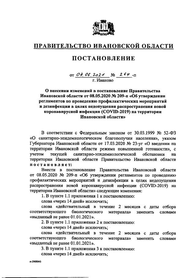 Постановление Правительства Ивановской области от 04.06.2021 N 264-п "О внесении изменений в постановление Правительства Ивановской области от 08.05.2020 N 209-п "Об утверждении регламентов по проведению профилактических мероприятий и дезинфекции в целях недопущения распространения новой коронавирусной инфекции (COVID-2019) на территории Ивановской области"
