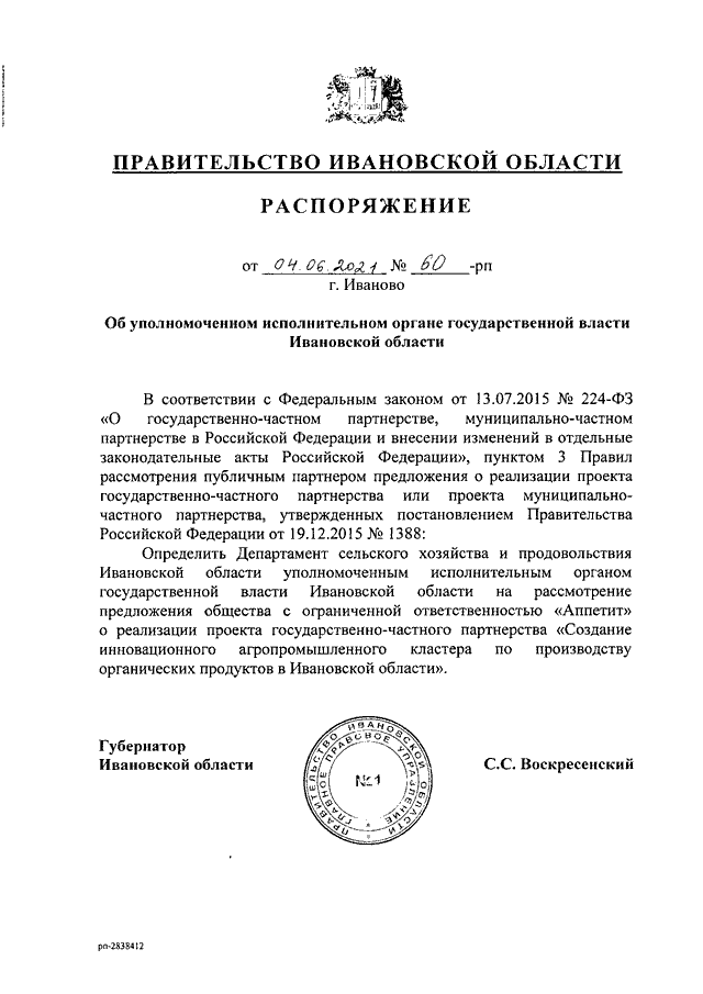 Распоряжение Правительства Ивановской области от 04.06.2021 N 60-рп "Об уполномоченном исполнительном органе государственной власти Ивановской области"
