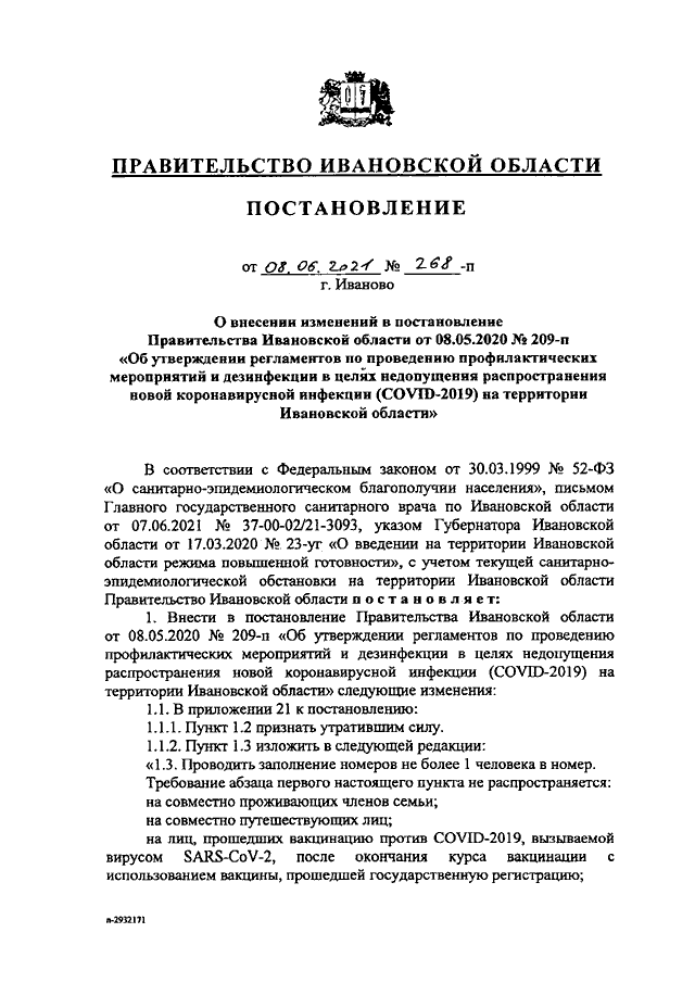Постановление Правительства Ивановской области от 08.06.2021 N 268-п "О внесении изменений в постановление Правительства Ивановской области от 08.05.2020 N 209-п "Об утверждении регламентов по проведению профилактических мероприятий и дезинфекции в целях недопущения распространения новой коронавирусной инфекции (COVID-2019) на территории Ивановской области"