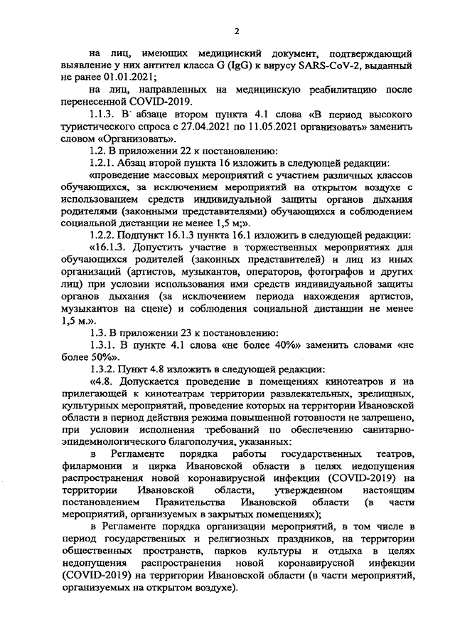 Постановление Правительства Ивановской области от 08.06.2021 N 268-п "О внесении изменений в постановление Правительства Ивановской области от 08.05.2020 N 209-п "Об утверждении регламентов по проведению профилактических мероприятий и дезинфекции в целях недопущения распространения новой коронавирусной инфекции (COVID-2019) на территории Ивановской области"