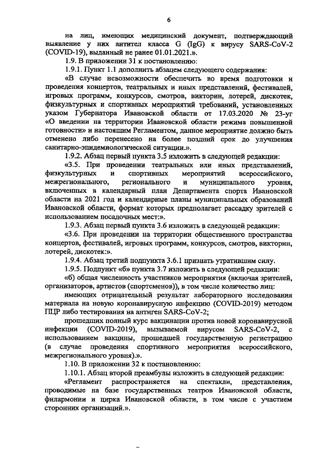 Постановление Правительства Ивановской области от 21.06.2021 N 276-п "О внесении изменений в постановление Правительства Ивановской области от 08.05.2020 N 209-п "Об утверждении регламентов по проведению профилактических мероприятий и дезинфекции в целях недопущения распространения новой коронавирусной инфекции (COVID-2019) на территории Ивановской области"