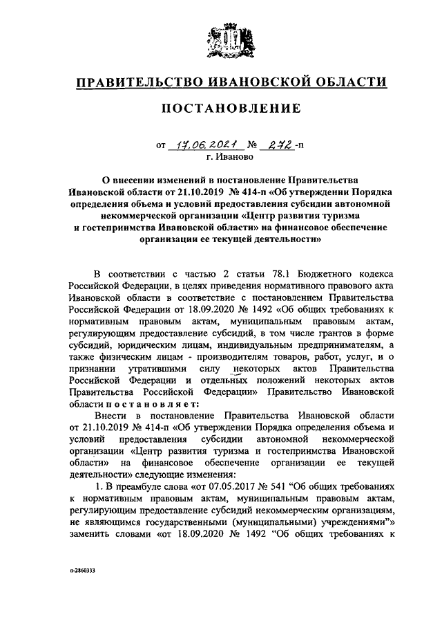 Постановление Правительства Ивановской области от 17.06.2021 N 272-п "О внесении изменений в постановление Правительства Ивановской области от 21.10.2019 N 414-п "Об утверждении Порядка определения объема и условий предоставления субсидии автономной некоммерческой организации "Центр развития туризма и гостеприимства Ивановской области" на финансовое обеспечение организации ее текущей деятельности"