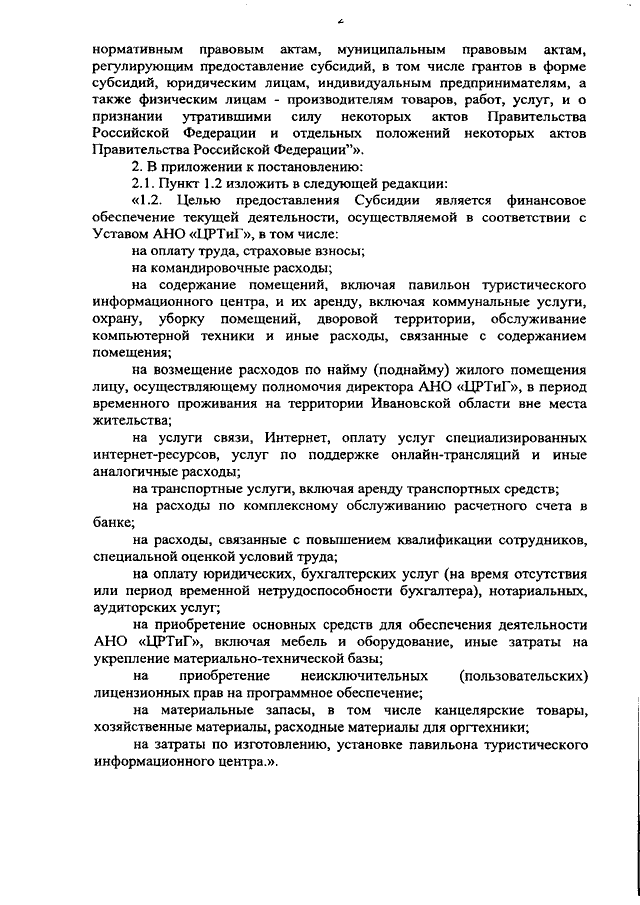 Постановление Правительства Ивановской области от 17.06.2021 N 272-п "О внесении изменений в постановление Правительства Ивановской области от 21.10.2019 N 414-п "Об утверждении Порядка определения объема и условий предоставления субсидии автономной некоммерческой организации "Центр развития туризма и гостеприимства Ивановской области" на финансовое обеспечение организации ее текущей деятельности"