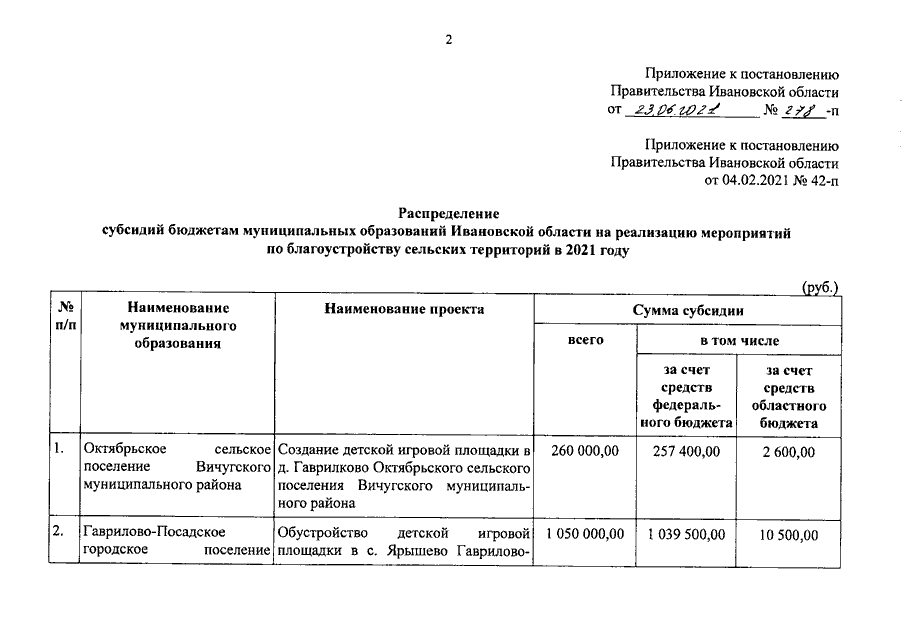 Постановление Правительства Ивановской области от 23.06.2021 N 278-п "О внесении изменения в постановление Правительства Ивановской области от 04.02.2021 N 42-п "О распределении субсидий бюджетам муниципальных образований Ивановской области на реализацию мероприятий по благоустройству сельских территорий в 2021 году"