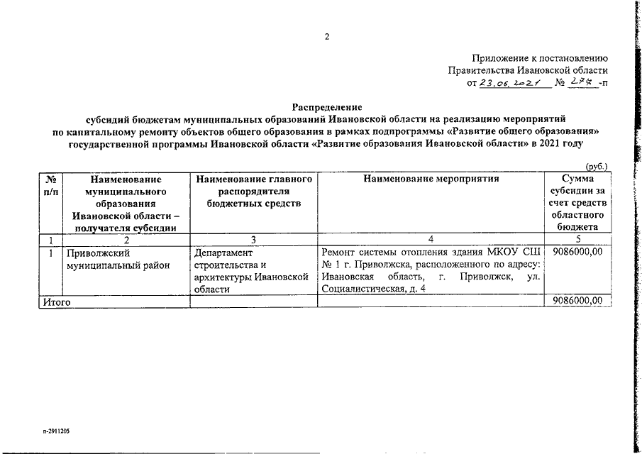 Постановление Правительства Ивановской области от 23.06.2021 N 277-п "О распределении субсидий бюджетам муниципальных образований Ивановской области на реализацию мероприятий по капитальному ремонту объектов общего образования в рамках подпрограммы "Развитие общего образования" государственной программы Ивановской области "Развитие образования Ивановской области" в 2021 году"