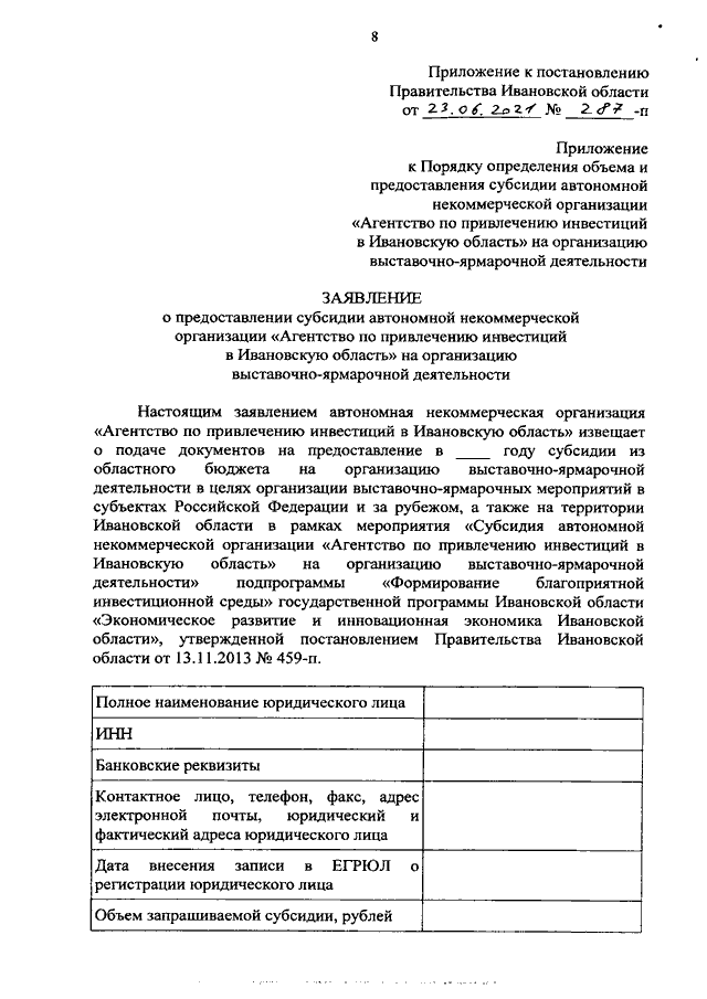 Постановление Правительства Ивановской области от 23.06.2021 N 287-п "О внесении изменений в постановления Правительства Ивановской области от 07.02.2018 N 27-п "Об утверждении Порядка предоставления субсидии автономной некоммерческой организации "Агентство по привлечению инвестиций в Ивановскую область" на организацию выставочно-ярмарочной деятельности и о внесении изменений в постановление Правительства Ивановской области от 23.11.2012 N 490-п "Об утверждении регламента организации подготовки и проведения мероприятий в сфере международных и внешнеэкономических связей Правительства Ивановской области и исполнительных органов государственной власти Ивановской области, а также выставочно-ярмарочных мероприятий в субъектах Российской Федерации и за рубежом" и от 26.02.2019 N 64-п "Об утверждении Порядка определения объема и предоставления субсидии автономной некоммерческой организации "Центр развития предпринимательства и поддержки экспорта Ивановской области" на развитие центра поддержки экспорта"