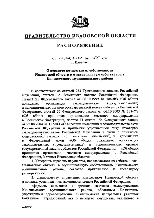 Распоряжение Правительства Ивановской области от 23.06.2021 N 65-рп "О передаче имущества из собственности Ивановской области в муниципальную собственность Кинешемского муниципального района"