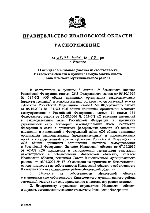 Распоряжение Правительства Ивановской области от 23.06.2021 N 67-рп "О передаче земельного участка из собственности Ивановской области в муниципальную собственность Кинешемского муниципального района"