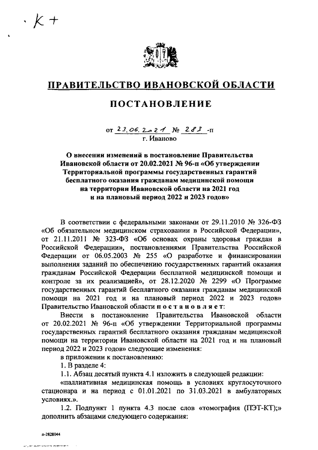 Постановление Правительства Ивановской области от 23.06.2021 N 283-п "О внесении изменений в постановление Правительства Ивановской области от 20.02.2021 N 96-п "Об утверждении Территориальной программы государственных гарантий бесплатного оказания гражданам медицинской помощи на территории Ивановской области на 2021 год и на плановый период 2022 и 2023 годов"