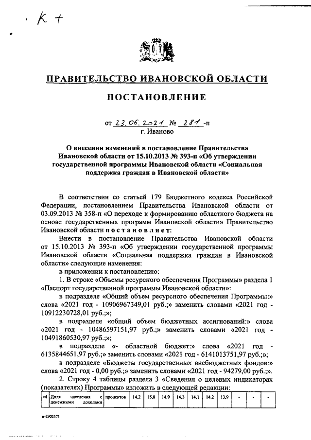 Постановление Правительства Ивановской области от 23.06.2021 N 281-п "О внесении изменений в постановление Правительства Ивановской области от 15.10.2013 N 393-п "Об утверждении государственной программы Ивановской области "Социальная поддержка граждан в Ивановской области"