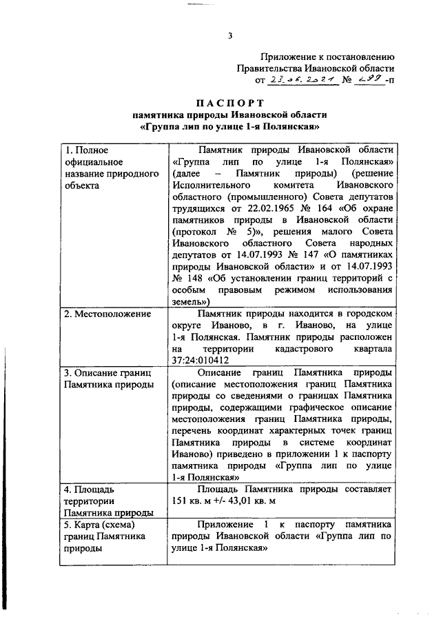 Постановление Правительства Ивановской области от 23.06.2021 N 299-п "О памятнике природы Ивановской области "Группа лип по улице 1-я Полянская" (вместе с "Паспортом памятника природы Ивановской области "Группа лип по улице 1-я Полянская")
