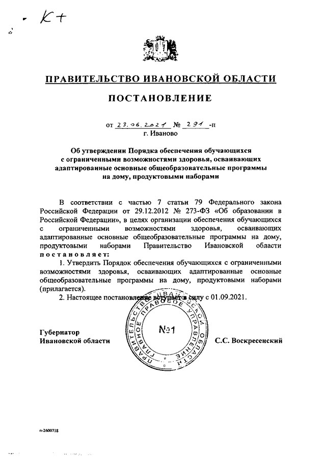 Постановление Правительства Ивановской области от 23.06.2021 N 291-п "Об утверждении Порядка обеспечения обучающихся с ограниченными возможностями здоровья, осваивающих адаптированные основные общеобразовательные программы на дому, продуктовыми наборами"