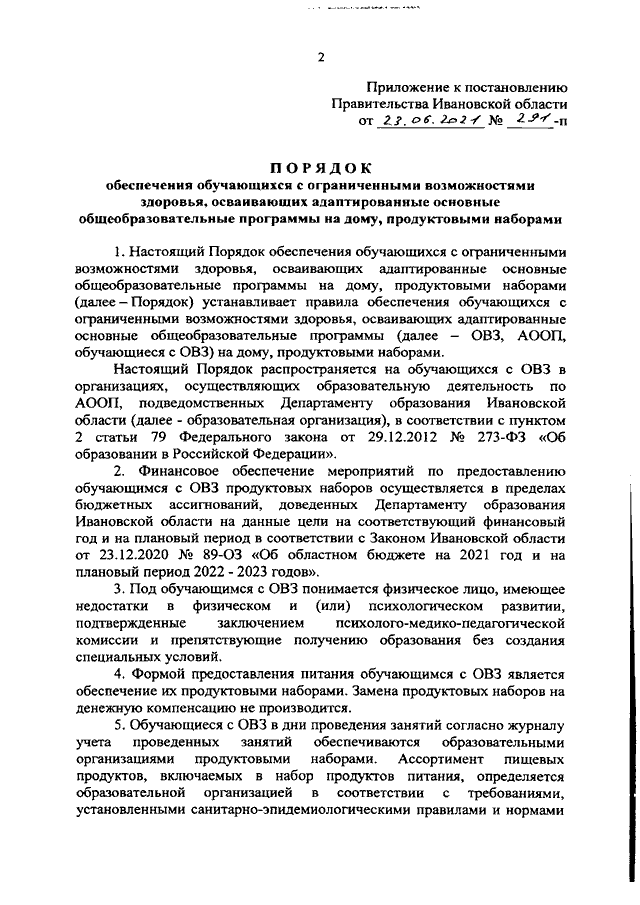Постановление Правительства Ивановской области от 23.06.2021 N 291-п "Об утверждении Порядка обеспечения обучающихся с ограниченными возможностями здоровья, осваивающих адаптированные основные общеобразовательные программы на дому, продуктовыми наборами"