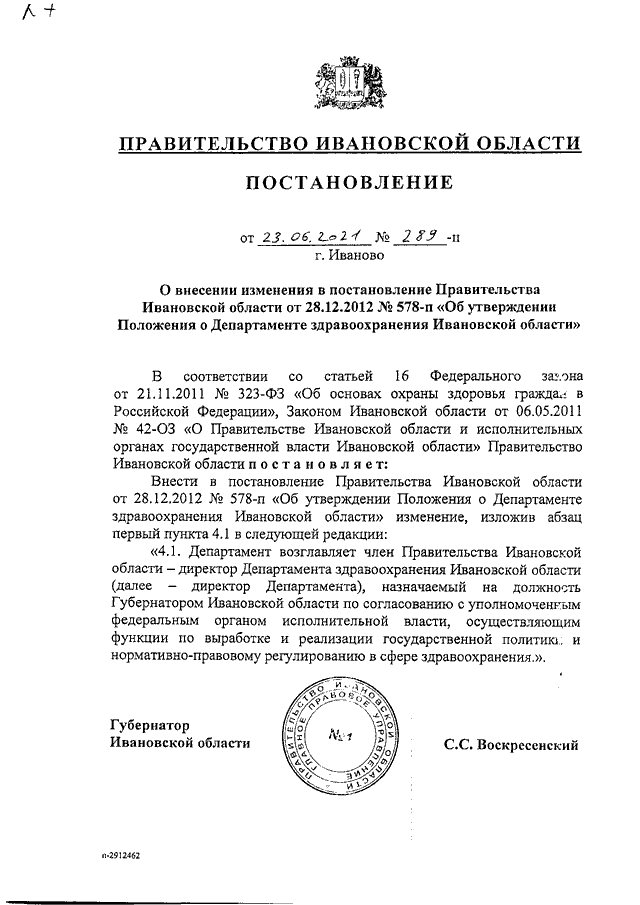 Постановление Правительства Ивановской области от 23.06.2021 N 289-п "О внесении изменения в постановление Правительства Ивановской области от 28.12.2012 N 578-п "Об утверждении Положения о Департаменте здравоохранения Ивановской области"