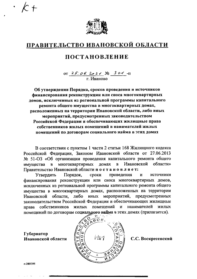 Постановление Правительства Ивановской области от 25.06.2021 N 301-п "Об утверждении Порядка, сроков проведения и источников финансирования реконструкции или сноса многоквартирных домов, исключенных из региональной программы капитального ремонта общего имущества в многоквартирных домах, расположенных на территории Ивановской области, либо иных мероприятий, предусмотренных законодательством Российской Федерации и обеспечивающих жилищные права собственников жилых помещений и нанимателей жилых помещений по договорам социального найма в этих домах"