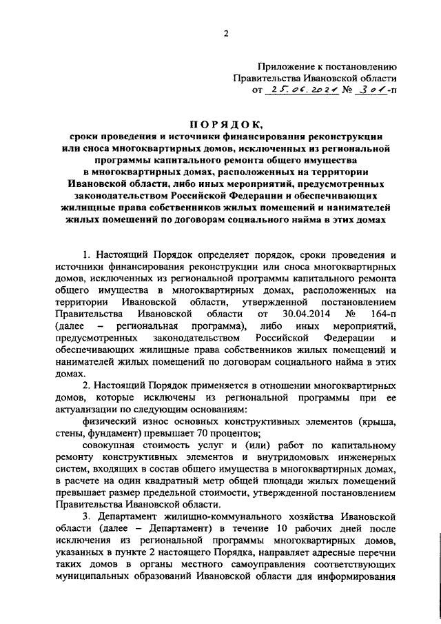 Постановление Правительства Ивановской области от 25.06.2021 N 301-п "Об утверждении Порядка, сроков проведения и источников финансирования реконструкции или сноса многоквартирных домов, исключенных из региональной программы капитального ремонта общего имущества в многоквартирных домах, расположенных на территории Ивановской области, либо иных мероприятий, предусмотренных законодательством Российской Федерации и обеспечивающих жилищные права собственников жилых помещений и нанимателей жилых помещений по договорам социального найма в этих домах"