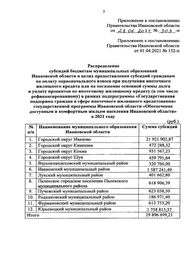 Постановление Правительства Ивановской области от 28.06.2021 N 303-п "О внесении изменения в постановление Правительства Ивановской области от 01.04.2021 N 152-п "О распределении субсидий бюджетам муниципальных образований Ивановской области в целях предоставления субсидий гражданам на оплату первоначального взноса при получении ипотечного жилищного кредита или на погашение основной суммы долга и уплату процентов по ипотечному жилищному кредиту (в том числе рефинансированному) в рамках подпрограммы "Государственная поддержка граждан в сфере ипотечного жилищного кредитования" государственной программы Ивановской области "Обеспечение доступным и комфортным жильем населения Ивановской области" в 2021 году"