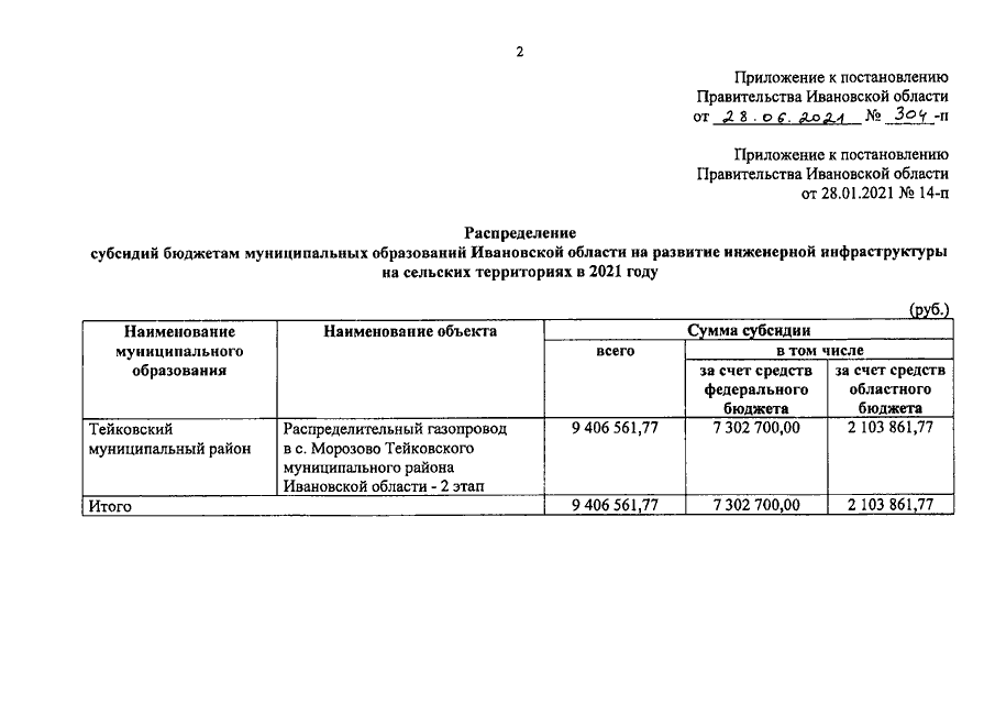Постановление Правительства Ивановской области от 28.06.2021 N 304-п "О внесении изменения в постановление Правительства Ивановской области от 28.01.2021 N 14-п "О распределении субсидий бюджетам муниципальных образований Ивановской области на развитие инженерной инфраструктуры на сельских территориях в 2021 году"