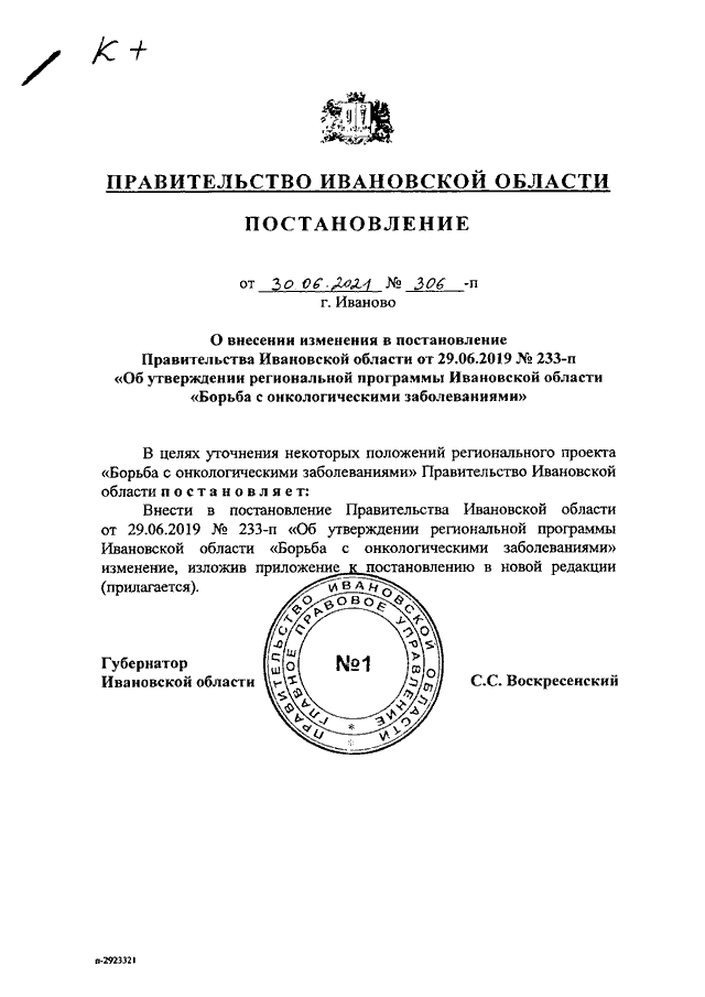 Постановление Правительства Ивановской области от 30.06.2021 N 306-п "О внесении изменения в постановление Правительства Ивановской области от 29.06.2019 N 233-п "Об утверждении региональной программы Ивановской области "Борьба с онкологическими заболеваниями"