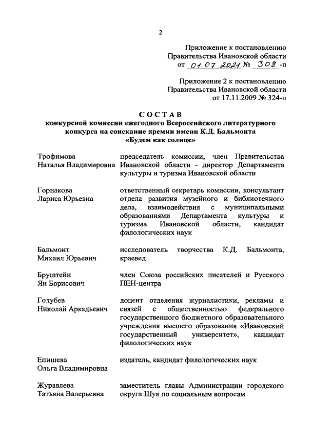 Постановление Правительства Ивановской области от 01.07.2021 N 308-п "О внесении изменения в постановление Правительства Ивановской области от 17.11.2009 N 324-п "О подготовке и проведении ежегодного Всероссийского литературного конкурса на соискание премии имени К.Д. Бальмонта "Будем как солнце"