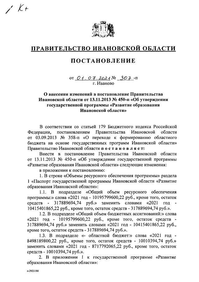 Постановление Правительства Ивановской области от 01.07.2021 N 307-п "О внесении изменений в постановление Правительства Ивановской области от 13.11.2013 N 450-п "Об утверждении государственной программы "Развитие образования Ивановской области" (вместе с "Порядком предоставления грантов в форме субсидий организациям, осуществляющим образовательную деятельность по образовательным программам среднего профессионального образования, на финансовое обеспечение обучения граждан Российской Федерации по имеющим государственную аккредитацию образовательным программам среднего профессионального образования")