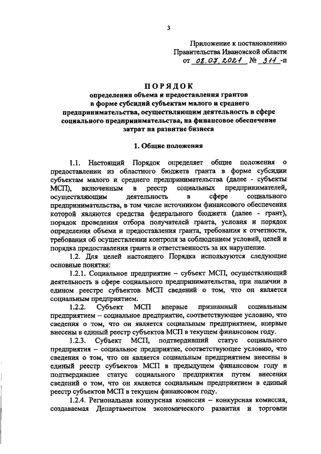 Постановление Правительства Ивановской области от 08.07.2021 N 311-п "Об утверждении Порядка определения объема и предоставления грантов в форме субсидий субъектам малого и среднего предпринимательства, осуществляющим деятельность в сфере социального предпринимательства, на финансовое обеспечение затрат на развитие бизнеса"