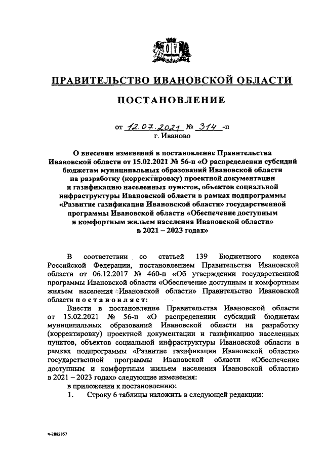 Постановление Правительства Ивановской области от 12.07.2021 N 314-п "О внесении изменений в постановление Правительства Ивановской области от 15.02.2021 N 56-п "О распределении субсидий бюджетам муниципальных образований Ивановской области на разработку (корректировку) проектной документации и газификацию населенных пунктов, объектов социальной инфраструктуры Ивановской области в рамках подпрограммы "Развитие газификации Ивановской области" государственной программы Ивановской области "Обеспечение доступным и комфортным жильем населения Ивановской области" в 2021 - 2023 годах"