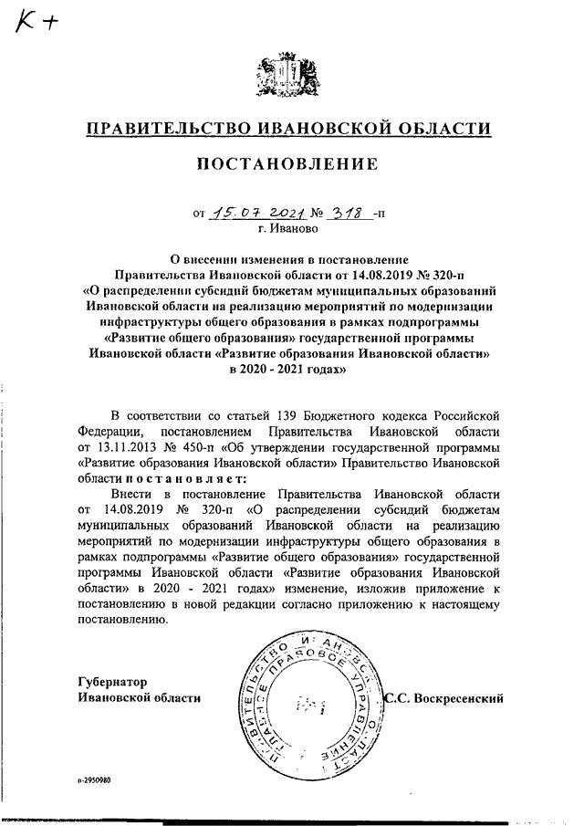 Постановление Правительства Ивановской области от 15.07.2021 N 318-п "О внесении изменения в постановление Правительства Ивановской области от 14.08.2019 N 320-п "О распределении субсидий бюджетам муниципальных образований Ивановской области на реализацию мероприятий по модернизации инфраструктуры общего образования в рамках подпрограммы "Развитие общего образования" государственной программы Ивановской области "Развитие образования Ивановской области" в 2020 - 2021 годах"