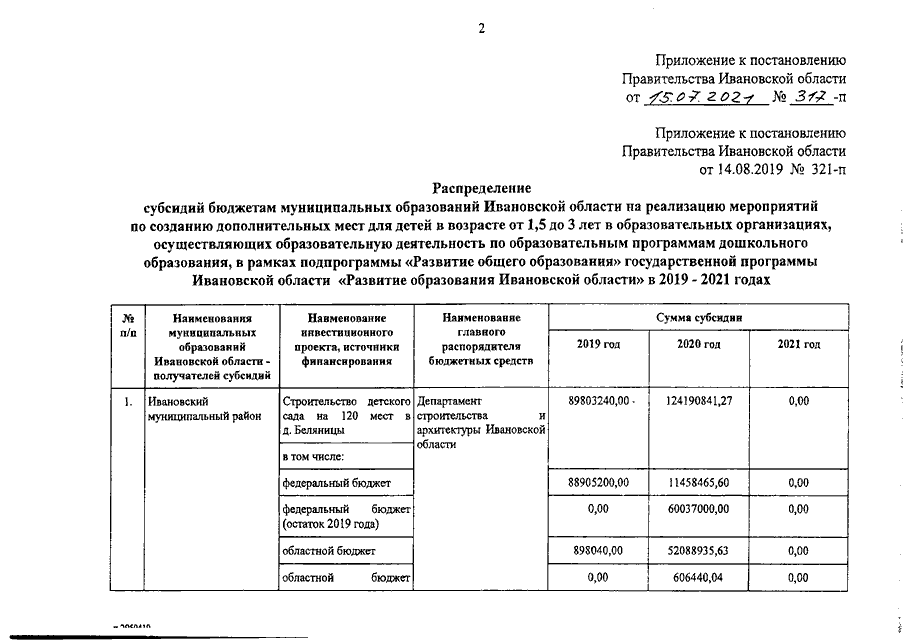 Постановление Правительства Ивановской области от 15.07.2021 N 317-п "О внесении изменения в постановление Правительства Ивановской области от 14.08.2019 N 321-п "О распределении субсидий бюджетам муниципальных образований Ивановской области на реализацию мероприятий по созданию дополнительных мест для детей в возрасте от 1,5 до 3 лет в образовательных организациях, осуществляющих образовательную деятельность по образовательным программам дошкольного образования, в рамках подпрограммы "Развитие общего образования" государственной программы Ивановской области "Развитие образования Ивановской области" в 2019 - 2021 годах"